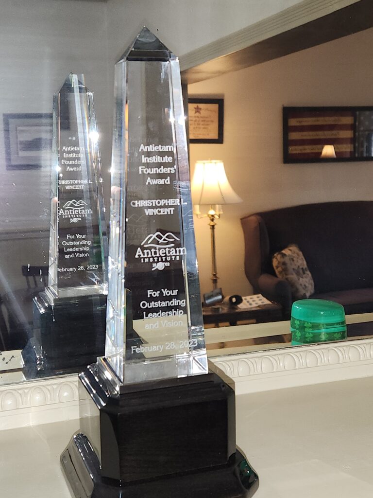 On the two-year anniversary of the founding of the Antietam Institute, Vice President Jim Rosebrock surprised President Chris Vincent at the February Board meeting with the presentation of the Founder’s Award recognizing Chris’s outstanding leadership and his vision and central role in establishing the Institute.