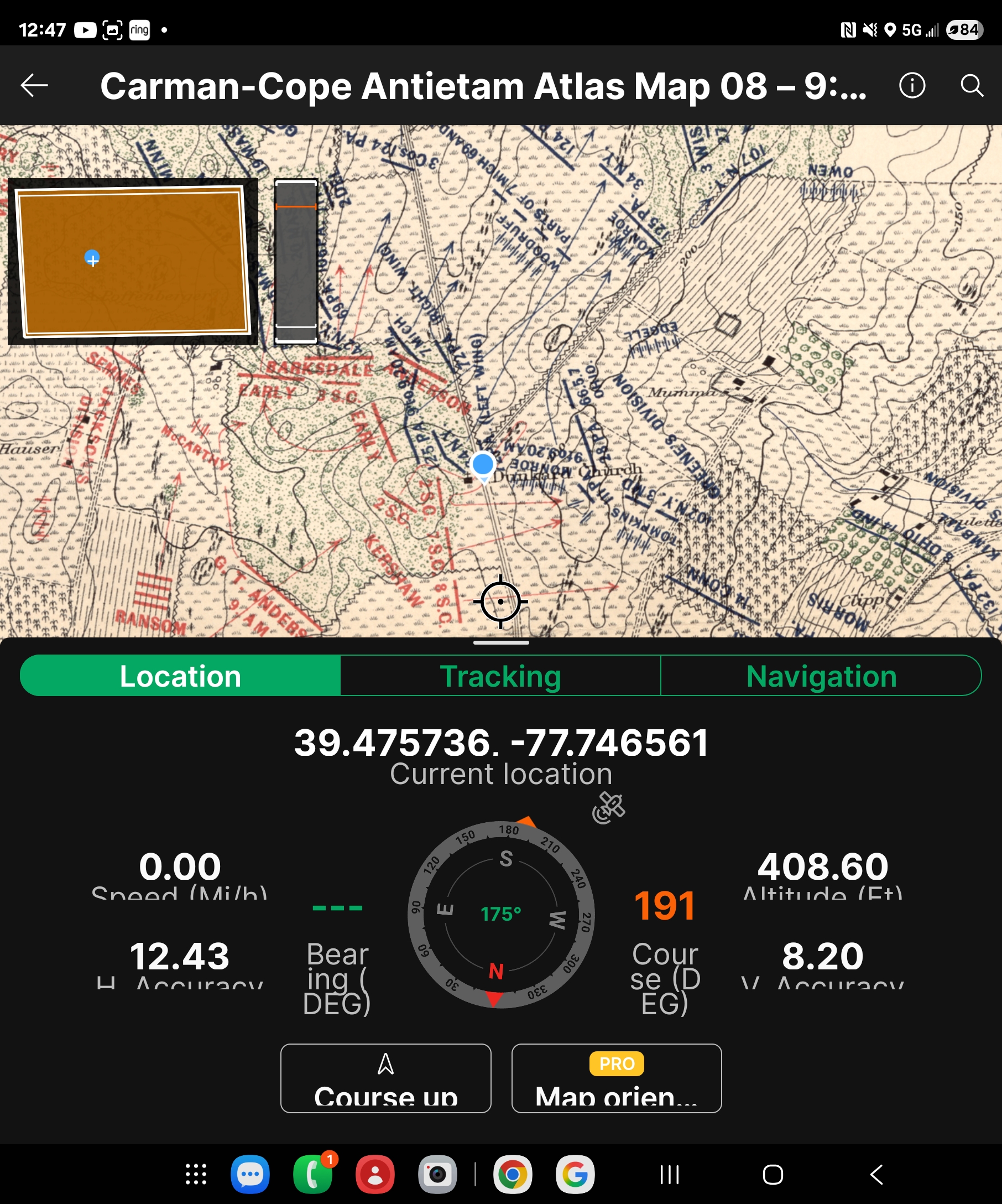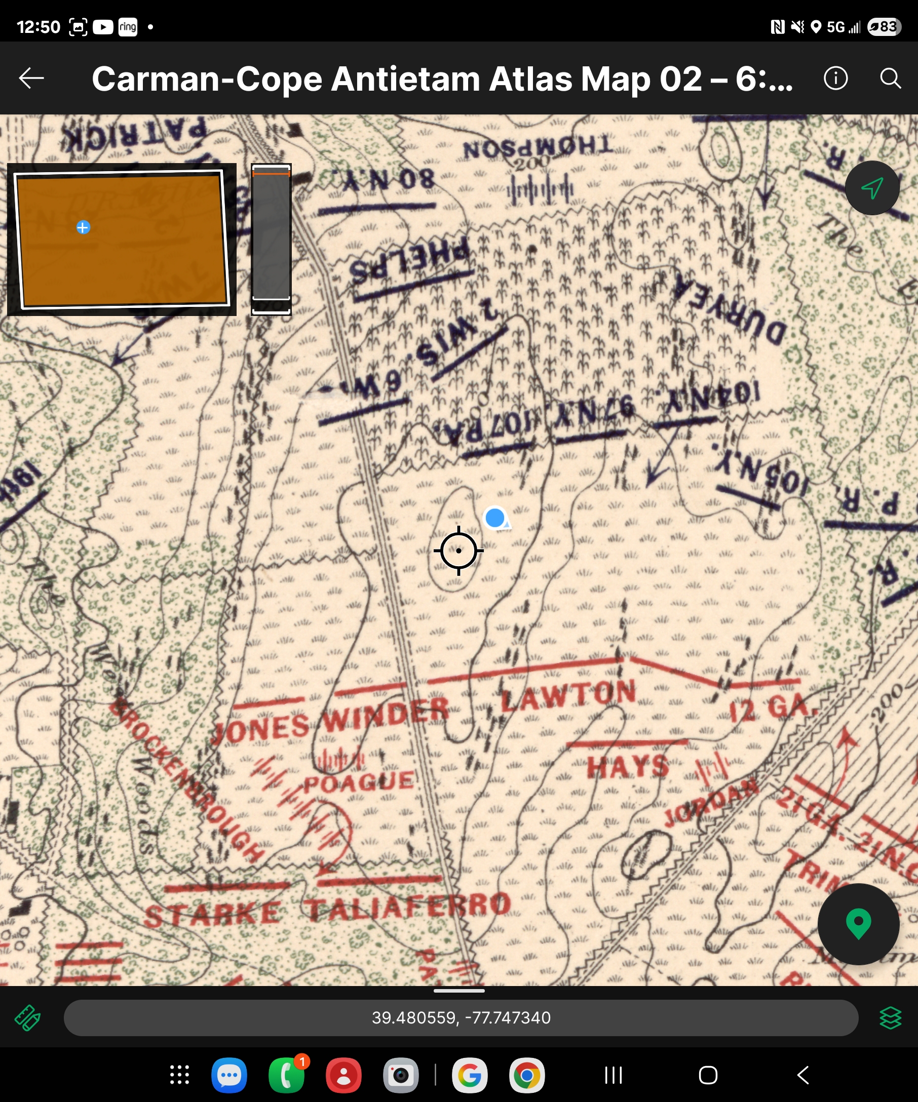 Views of two of the 14 maps of the Atlas as seen on a smartphone on the Antietam National Battlefield. Above, near the Dunker Church (9am, 17 September 1862) with navigation dashboard open. Below, near the Miller Cornfield (6am) .