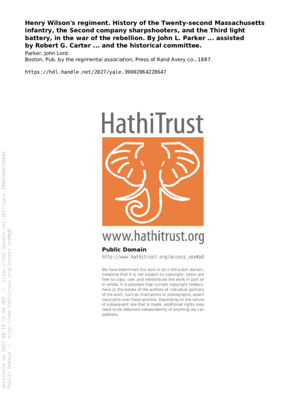 - Henry Wilson's regiment. History of the Twenty-second Massachusetts infantry, the Second company sharpshooters, and the Third light battery, in the war of the rebellion