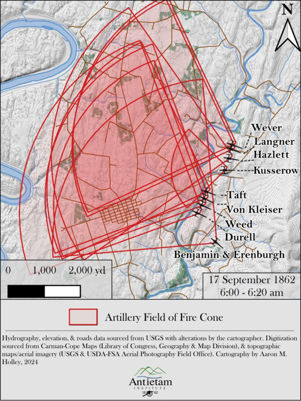 - Map depicting Field of fire cone map for the Federal guns of position between 6:00 and 6:20 a.m. highlighting the maximum ranges of guns without considering terrain,
